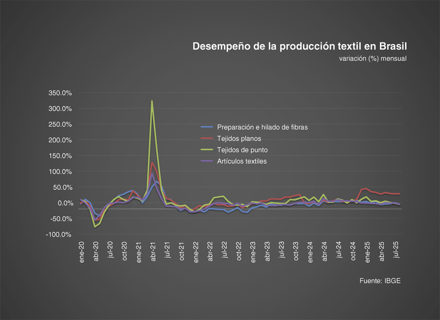 En contraste, la fabricación de tejidos planos y de punto mantiene un desempeño sostenido. Sin embargo, la hilatura, base de toda la cadena, muestra un avance marginal o incluso contracciones en algunos periodos.