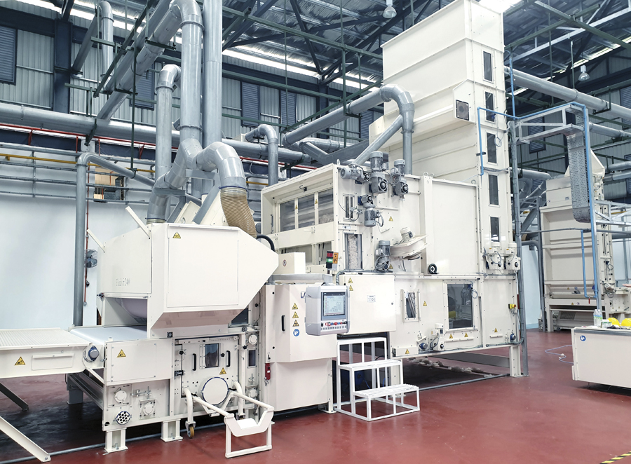 La termofijadora modelo TVP3 usa vapor saturado bajo presión para fijar el hilo a una temperatura más baja que un proceso de vapor sobrecalentado, debido a su mayor capacidad de intercambio de calor. Esto le da a la alfombra una mayor definición y una alta resiliencia. Por otro lado, el modelo DHS3 de vapor sobrecalentado ofrece una mayor resistencia a las manchas así como un hilo más voluminoso, gracias a proceso de triple capa y un termofijado muy uniforme.