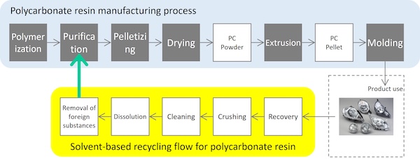 Teijin procesa la resina de PC que ya ha sido sometida a los pasos convencionales del reciclaje mecánico, como la trituración y el lavado, pero que no es adecuada para aplicaciones que requieren una alta transparencia. A continuación, la empresa disuelve el material en disolventes y elimina las impurezas para convertirlo en polímeros reutilizables. Este proceso permite a Teijin recuperar material cuyas propiedades, incluida la transparencia, son comparables a las del PC virgen.