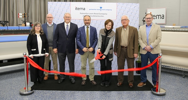 (left to right): Itema America CFO Stephanie Ort, Itema America Area Sales Manager Doug Merritt, Itema America President Scott Malcolm, Itema Group Chief Sales and Service Officer Matteo Mutti, Palmetto Loom Reed President and Owner Gladys Richardson, Palmetto Loom Reed Sales Manager Ron Lemonds, and Palmetto Loom Reed Business Development Phillip Gilliland cut the ribbon celebrating Itema America’s acquisition of Palmetto Loom Reed.