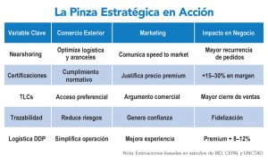 - Cambio de Discurso: “Nuestro precio FOB es 10% superior, pero nuestro TLC con EE. UU. garantiza arancel cero; nuestra logística nearshore reduce su inventario de seguridad en 40%, y nuestra trazabilidad completa elimina riesgos reputacionales y sanciones regulatorias”.