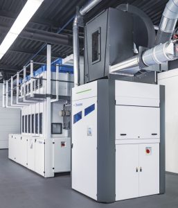 La secadora modelo VertiDry de Monforts se puede usar en combinación con máquinas de revestimiento, fulards, o con unidades de aplicación.